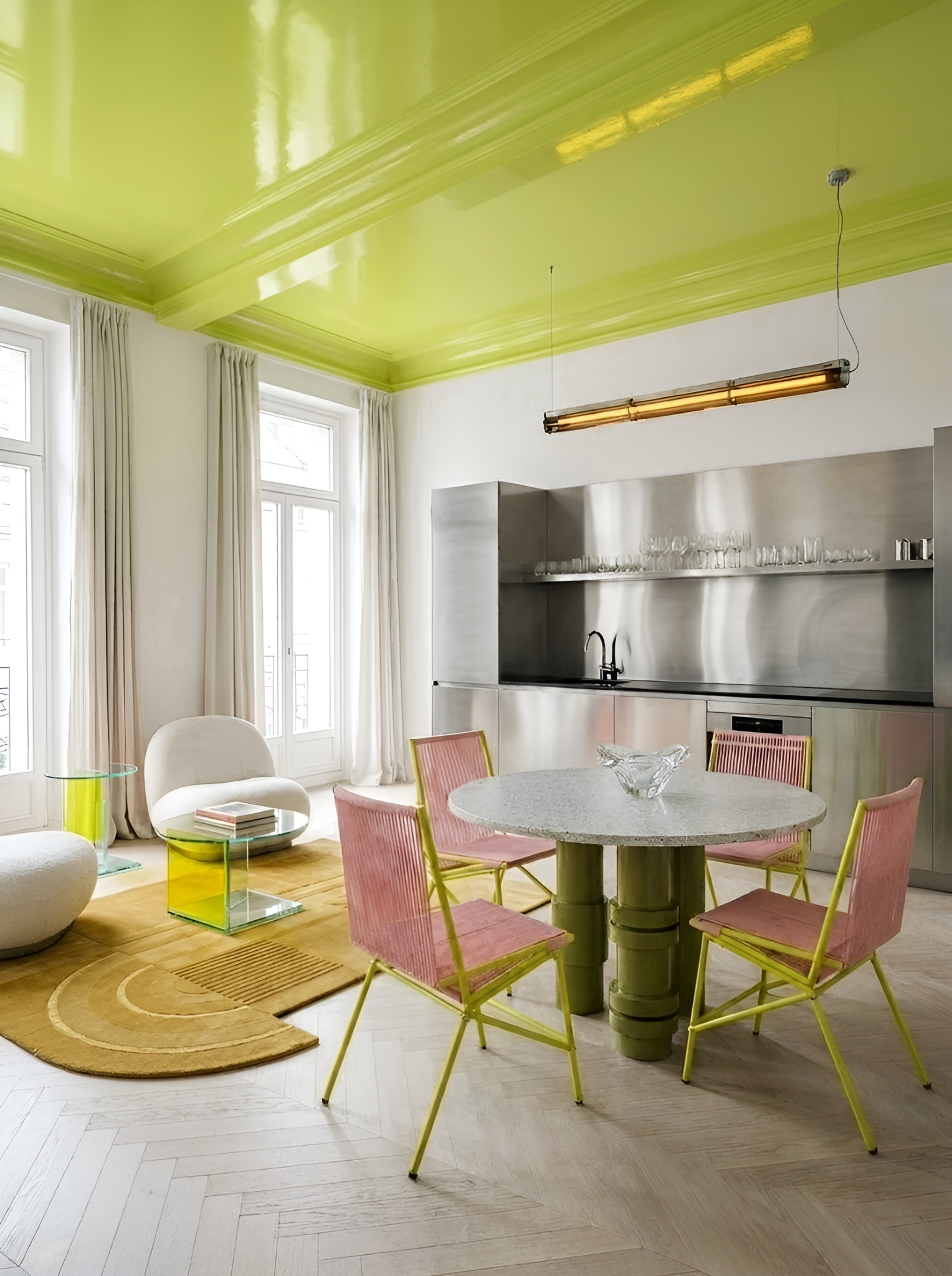 A lime ceiling does something that no other surface treatment quite achieves: it bathes everything below it in a warm, electric light that shifts as the day progresses. In morning sunlight, the room glows with citrus clarity; in evening artificial light, the ceiling becomes a rich, almost golden canopy. The stainless steel kitchen behind becomes a mirror for the colour, amplifying it across the room.