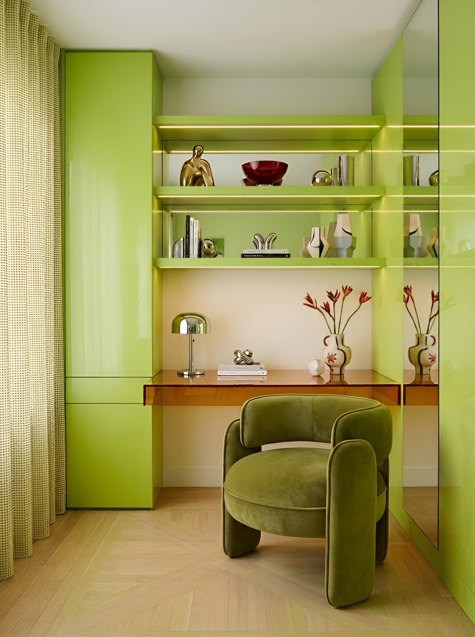 If the dining room uses lime with restraint, this home office uses it with total conviction. Walls, ceiling, built-in joinery, and shelving - all lacquered in the same sharp, electric lime. A deep olive velvet armchair sits at its centre like a deliberate anchor, its matte texture absorbing the light that the high-gloss surfaces around it are busy reflecting.