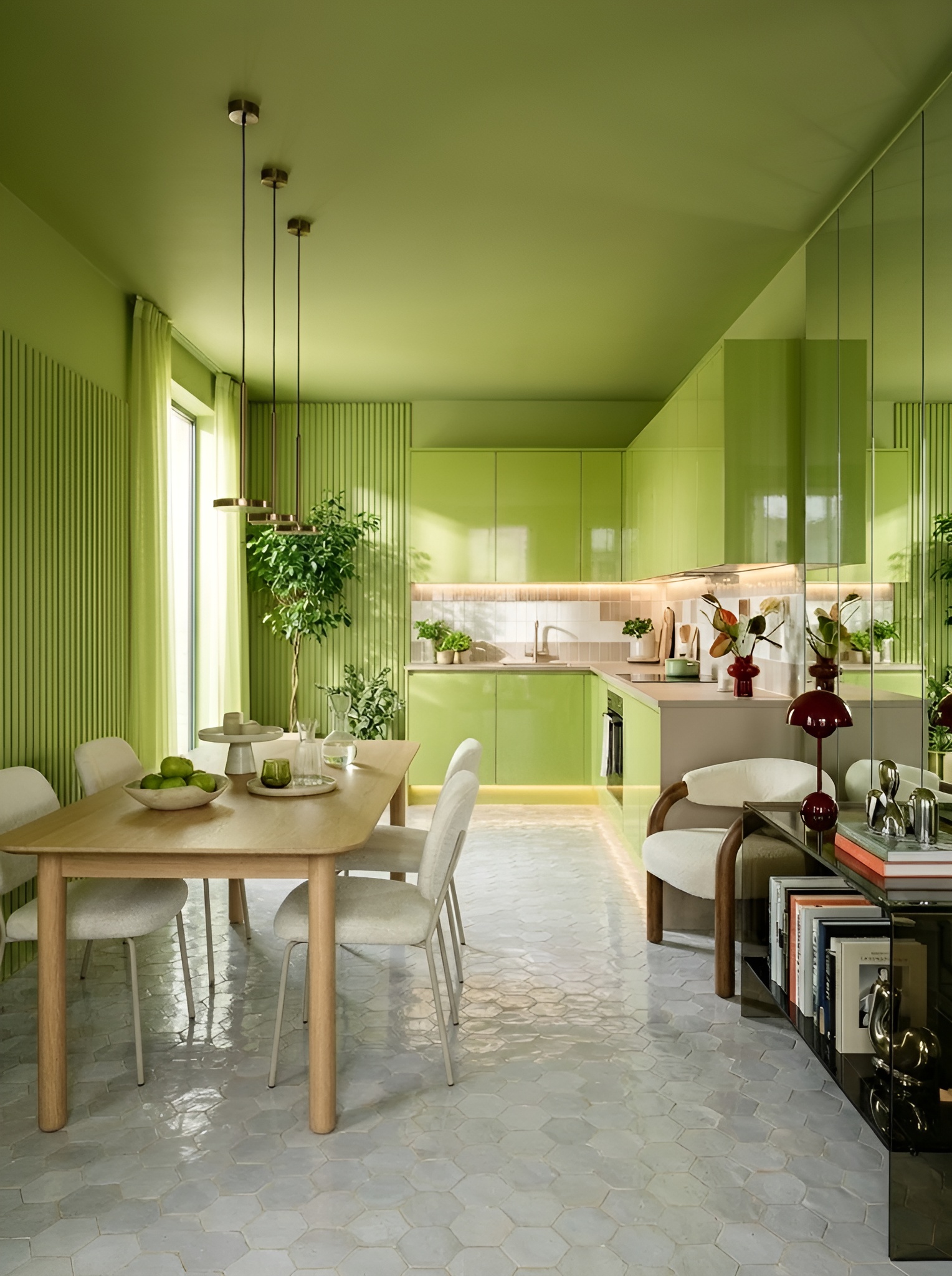 The most resolved space of the four - and the one that makes the strongest case for citrus lime as a serious, long-term design choice rather than a passing trend. A full open-plan kitchen and dining space, entirely wrapped in lacquered lime joinery from floor to ceiling, with ribbed cabinetry doors that add tactile depth to the colour’s already complex surface. The ceiling continues the lime above, making the room feel like a single, unified object rather than a collection of surfaces.