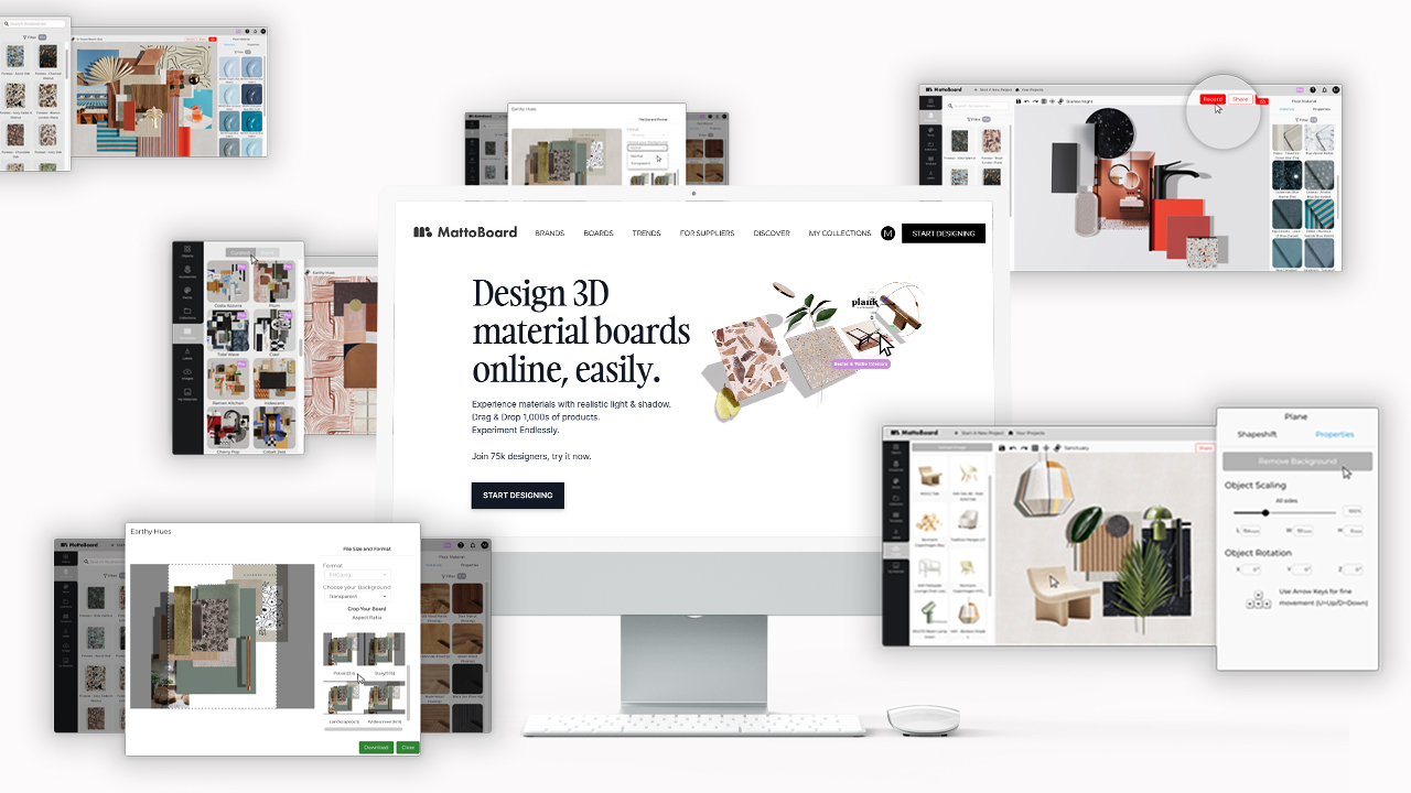 What are you waiting for? Click ‘Start designing now’ to start creating professional 3D material boards for your interior design projects. To access MattoBoard’s full professional potential, sign up to MattoBoard Pro. Find out more here.